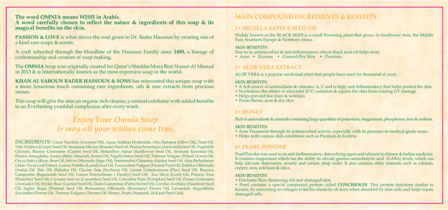 OMNIA was never created to be ordinary. Infused with 24K Pure Gold and 5% Diamond Dust, this masterpiece redefines luxury skincare. Crafted with rare botanical extracts including Olive Oil, Honey, Aloe Vera and Nigella Sativa, it embodies centuries of heritage blended with modern refinement. OMNIA is not made for everyone. It is made for those who understand rarity.